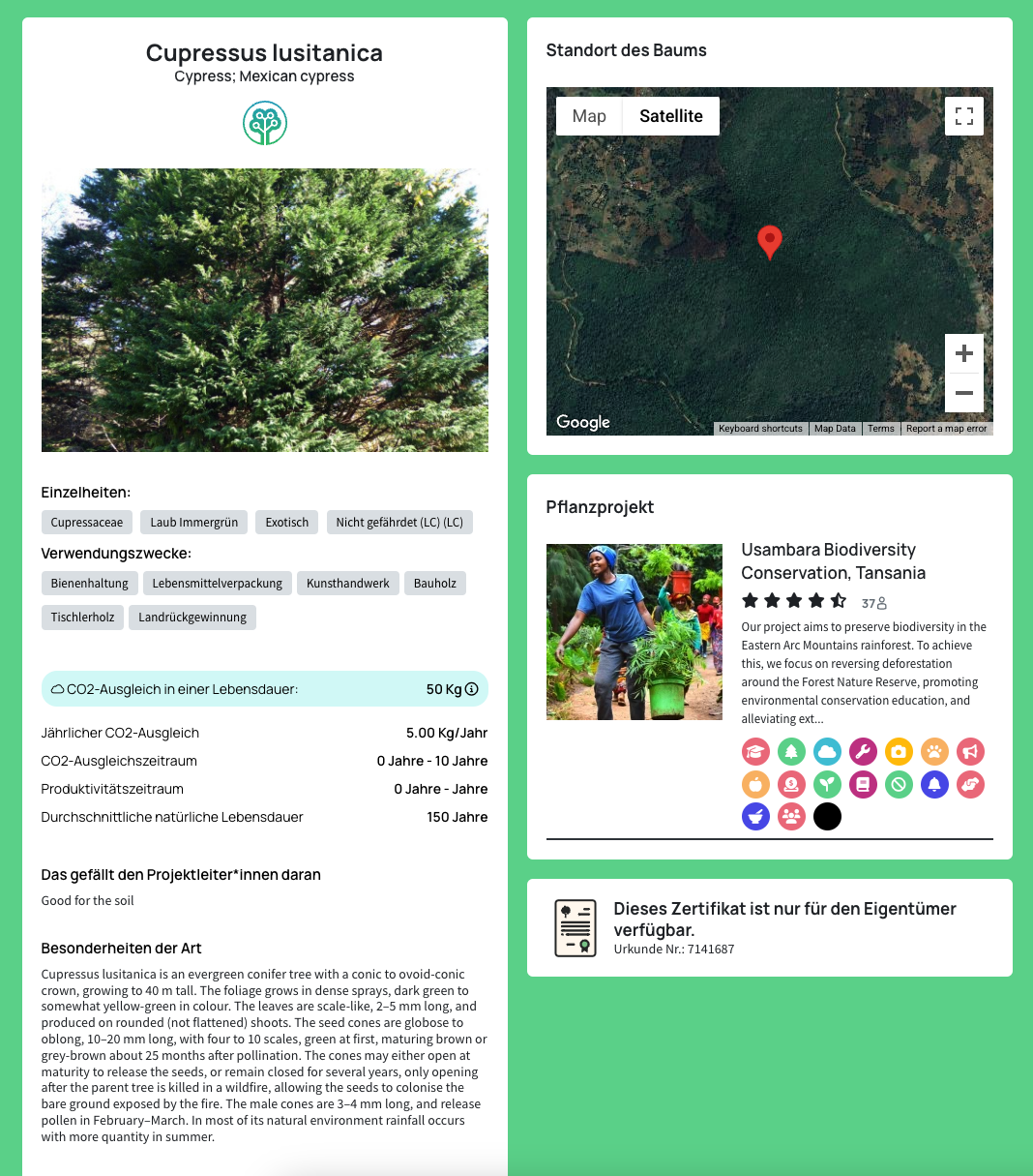 Tree-Nation ist eine Plattform, die es Unternehmen ermöglicht, Aufforstungsprojekte zu unterstützen. Mit jedem gepflanzten Baum hilfst du, unsere Erde grüner und lebenswerter zu machen. Erfahre mehr über die Projekte hier: Tree-Nation.